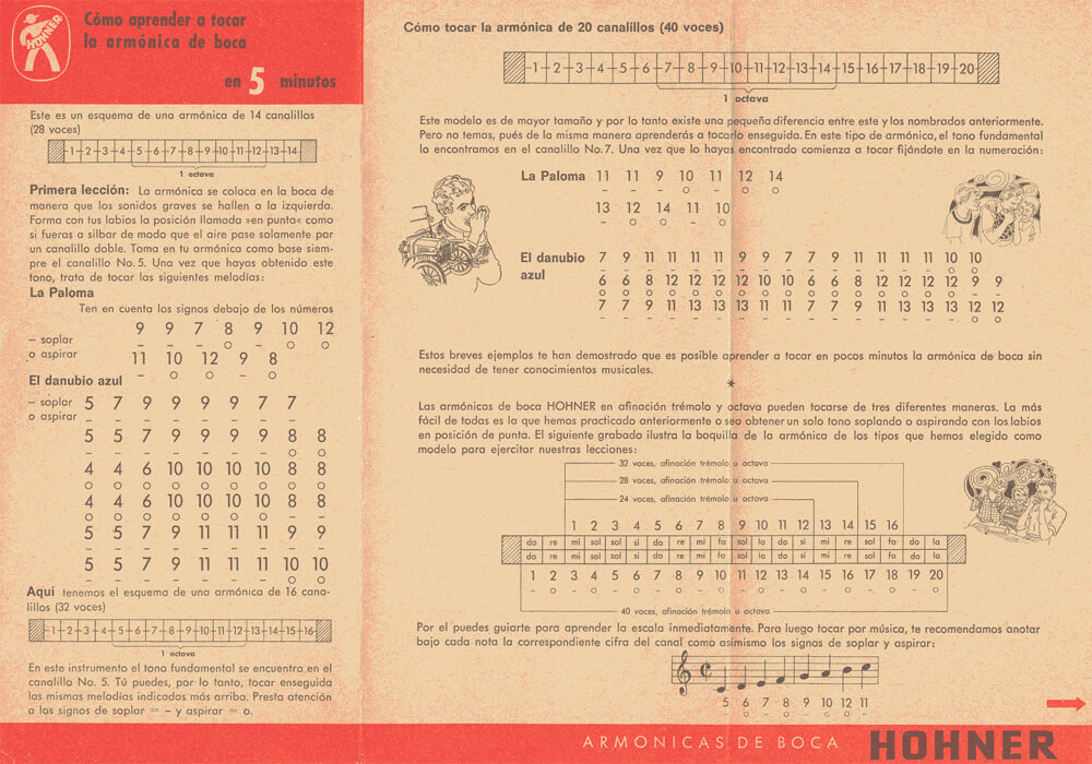 Los fabricantes de armónicas disponen en sus catálogos de métodos de aprendizajes y estudios, como ejemplo este pequeño pasquín de Hohner: